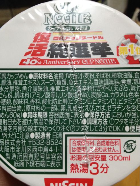 × [PR]上記の広告は3ヶ月以上新規記事投稿のないブログに表示されています。新しい記事を書く事で広告が消えます。 今宵もiPhoneとJawbone JAMBOXをジップロックに入れて、「映画音楽」プレイリストをQuick Mixで聴きながら風呂なう♨ ジップロックと湯気越しにつき 曇ってるのはご愛嬌 はああ、極楽/\♪( ´▽`) つか、湯船と洗い場との温度差が激しい(>_<) PR 本放送は外勤め中だったのでちゃんと観られなかったNHKスペシャル、 『ヒューマン なぜ人間になれたのか▽第2集 グレートジャーニーの果てに』(→) の再放送をいま観ている。 無っ茶苦茶、面白いこれ!! 現在のところ学術上は別種とされている我らホモ・サピエンスとネアンデルタール人との、それぞれの繁栄と滅亡との理由を道具——ことに「投擲具の発明」の有無という点からはじめて発展的に検証しているのだが、なるほどなあと思うことしきりだ。 単なる狩猟の優位性というところから、ヒトとしての集団社会の維持と精神的な抑止力にも至る……いうまでもなく現代のICBM(大陸間弾道ミサイル)やSLBM(潜水艦発射弾道ミサイル)といった“究極の投擲具”などにも通じるものが語られている。 同番組内のコーヒーサーバの実験も含め、いわば、 「恐怖・威圧で支配されること」 を選んだが故にホモ・サピエンスは発展したかもしれないという投げかけ。 また、武器の開発を始めとしてネアンデルタール人が少数人で集まって云々しているだけでとどのつまりそこで終わってしまったのに対し、ホモ・サピエンスは分散する大人数が互いにアイデアを出し合い、そしてまずは試してみて上手くいったものを各々が真似たから発展があった——すなわち、ネットワーク——という切り口もとてもいい。 こういうの、凄く好きだ。 次回の第三集では、俺にいわせれば“人類史初の環境破壊”たる「農耕」を取り上げるそうだ。 どのように驚かせてくれるのか、楽しみな番組である。 ……というわけで、『ブラタモリ▽国分寺 遺跡編』再放送なう。 ここのところ、「総選挙」という言葉にはどうもいいイメージがない。 このエントリの本題ではないのでまあ詳細はハショるが、総選挙ばっかりやってる秋葉原系の豚と、逆に一向に肝心の総選挙を実施しない永田町系の豚とによるものだとだけいっておこう(笑) で、それはともかく以下の総選挙とその結果は、たいへんによろこばしい。 「歴代カップヌードル復活総選挙」(→) スペクトルマンや帰ってきたウルトラマンさらに仮面ライダー、国内初のマクドナルド、明治の小枝や不二家ハートチョコレート、そして我らが旧作ルパンなどと同じ1971年生まれの日清カップヌードルの40周年を記念して昨年行われた歴代のカップヌードルの人気投票だったわけだが、そこで堂々の1位に輝いたのが、 「カップヌードル 天そば」 だったというわけ。いやー、実に感慨深い。 カップヌードルとしては2つ目の製品で、札幌冬季五輪とかあさま山荘事件とか旧作ルパンと俺との出会いがあった記念すべき1972年に誕生。 後継たる、かの「日清どん兵衛」にその座を譲って1977年には生産中止となったために地味な印象はまぬがれず、俺は投票したのだが果たしてどこまで票を伸ばすかと危惧していたら予想を裏切る展開。Wikipediaなどによると、なんでも例によって伊集院光がこの幻(?)のカップヌードルを広く知らしめたらしく「食べてみたい」という興味からの票が集まったと見るべきだろうが、まあともかくもリアルタイムで喰らっていた者としては小躍りする結果だったのだった。 俺だけかもしれないがこの「カップヌードル 天そば」が売られていた1970年代半ばというのはまだそんなにカップ麺が日常茶飯事に入り込んではおらず、変なハナシだがどちらかといえば「ハレ」の食い物だったように思う。これはマクドナルドなどのファストフードも同じ。 なのでオリジナルのカップヌードルに輪をかけて喰らう機会の少なかった「天そば」ながら、これは旨いものだなと思った少年期の記憶がある。 だからどん兵衛が登場した際にこりゃまた旨いと思った反面、気づいてみたら「天そば」がひそかに消えていった事には、何かこう、得も言われぬ寂寥感みたいなものを当時から感じていた。 加えていえば、天そばに次いで1973年に発売された「カップヌードル カレー」が現在まで途切れることなくレギュラであり続けていることなども、その感情をいや増すものだ。 俺は「カレー」はそんなに喰らうほうではないのだが、たまに喰らうとその度に、同じ頃に登場し先輩格でありながらもしかしいまは無い「天そば」を思い、それこそエンリオ・モリコーネの音楽を耳にした時と同じような、胸を掻きむしられるような感情に襲われ続けてきたものだったのだったのだった。 そして35年(笑) 総選挙の結果を踏まえ、このたび目出度く記念復活した「天そば」が売られていたので、さっそく買ってきた。 そうそうこれこれ、このパッケージです